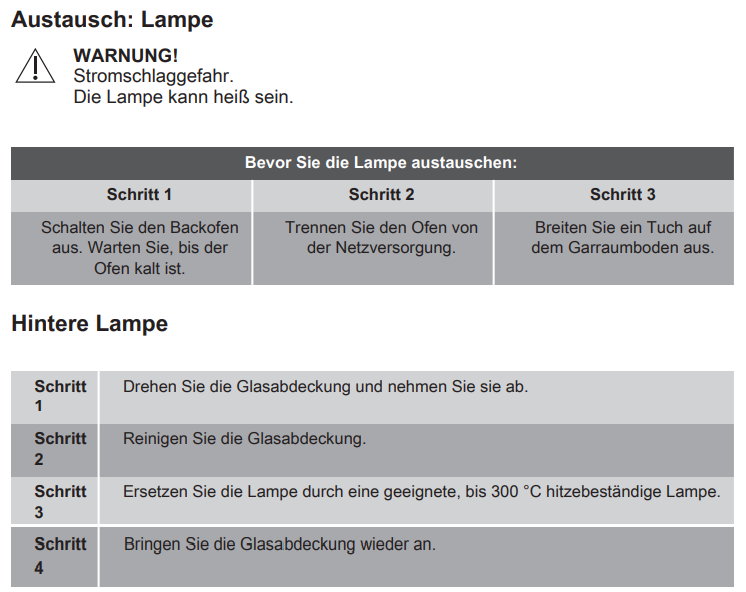 - der Wechsel der Backofenbeleuchtung nicht in der beschrieben