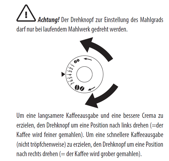 - Ändern Sie in diesem Fall die Einstellung auf einen gröberen Wert. Drehen Sie den Knopf zur Einstellung des Mahlgrads mit einem Klick im Uhrzeigersinn in Richtung "7".