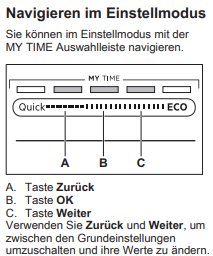 HINWEIS: Der Einstellmodus kann nicht während eines laufenden Programms aufgerufen werden! - Halten Sie die Tasten Quick und ECO für 3 Sekunden lang gleichzeitig gedrückt.