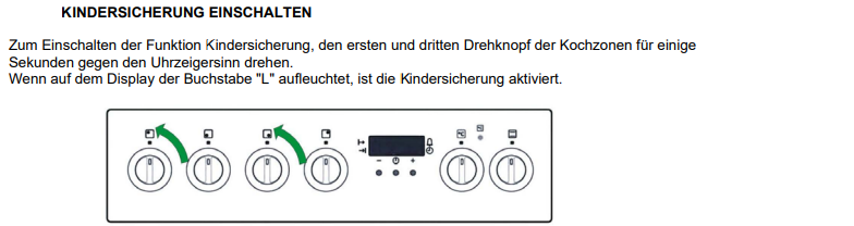 - zum Aktivieren: Knebel der hinteren linken und vorderen rechten Kochzone gleichzeitig gegen den Uhrzeigersinn drehen.