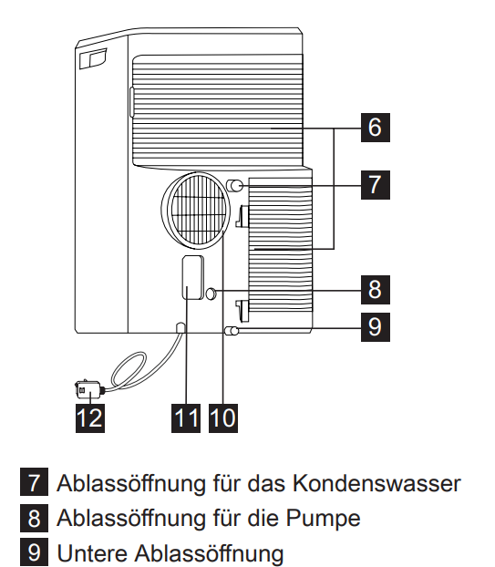 - HINWEIS: Die Auslassöffnung befindet sich weit unten am Gerät (Pos.9 im Bild oben). Nutzen Sie gegebenenfalls eine stabile Erhöhung oder ein Podest.