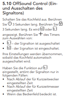 - Bei Kochfeldern mit OffSound Control Funktion kann der Bestätigungston, z.B. Veränderung der Kochstufe ausgeschaltet werden.