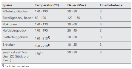 - Um ein optimales Back- bzw. Bratergebnis zu erhalten, beachten Sie die Tipps und Backtabellen in der des Backofens bzw. Herdes.