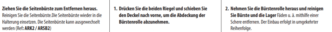 - Wie entferne ich die seitliche Bürste, Bodenwalze und den Staubbehälter?