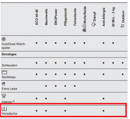 - In der finden Sie weitere Hinweise, zum Beispiel bei welchen Programmen eine Vorwäsche möglich ist und wo das Waschmittel für die Vorwäsche einzufüllen ist.