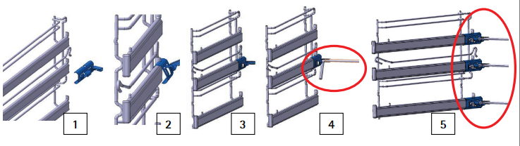 - Die Klemmen werden pro Ebene werksseitig an beiden Seiten angebracht (Schritt 1-3)