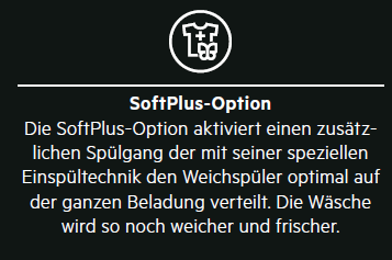 - Ist die Option SoftPlus aktiviert, optimiert sich die Verteilung des Weichspülers in der Wäsche.